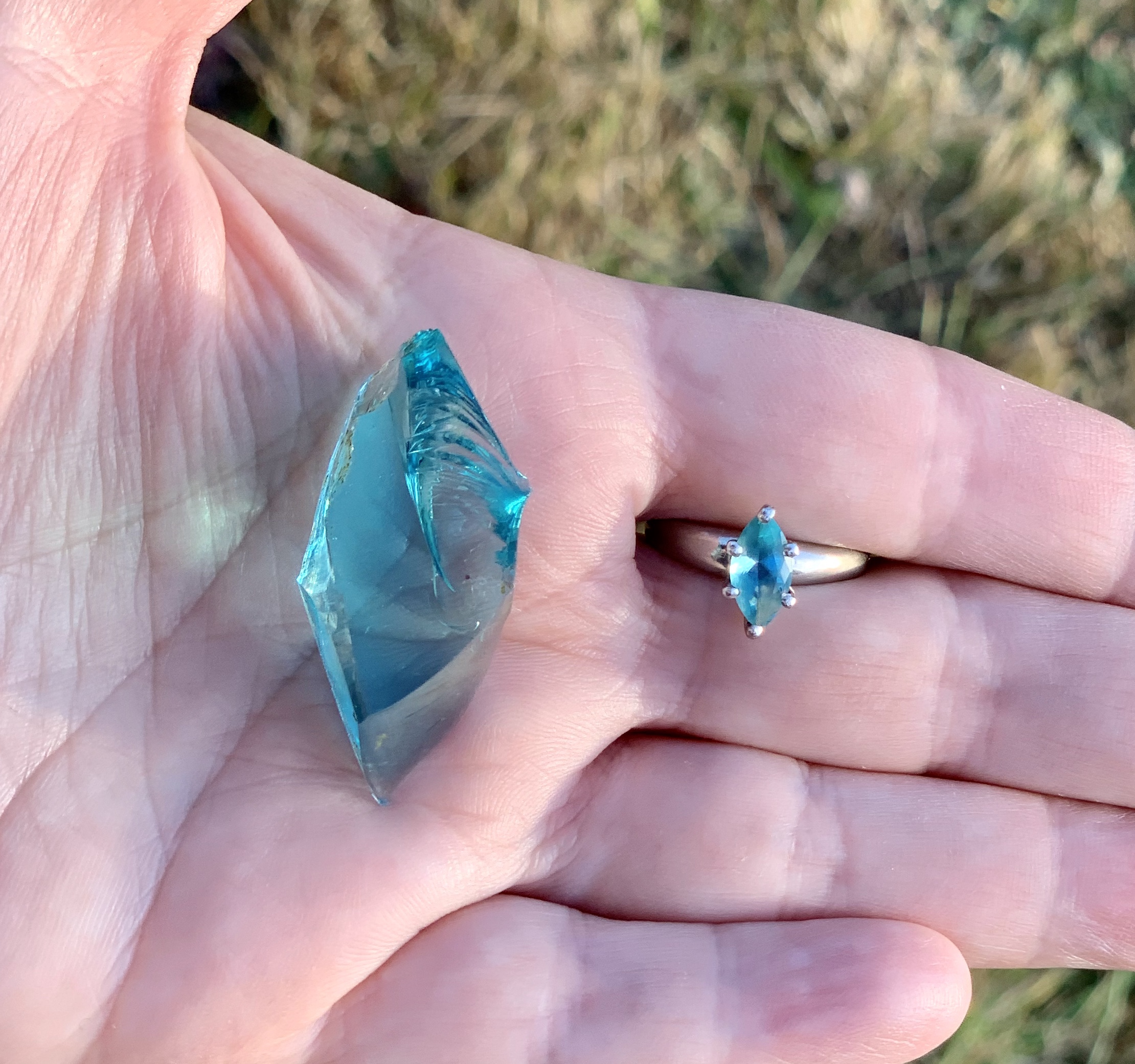 Then one day, I was pulling weeds when something light blue caught my eye in the brown dirt. It was the piece of blue glass pictured above. It instantly reminded me of the ring I’d purchased to help keep my mind on my book. I’d never seen anything like it in my yard. And, the shape? The shape I’d chosen to feature in my book. How could a random piece of glass look so much like the stone in the ring I’d chosen on eBay? I reached out my hand and pulled the glass from the dirt expecting to find that it was larger or the shape wasn’t quite right. But, there it was. So close in shape and color to my ring, I couldn’t dismiss it as coincidence. I stood up out of the dirt, dusted myself off, and went into the house to find my ring. It was sitting on my nightstand, strands of hair still clutched in the loose prong. I felt very strongly that I’d received a message.